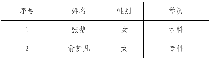 根据安徽皖江高速公路有限公司2025年公开招聘工作方案和有关制度要求,经过资格审查、综合素质测试、面试、笔试、背景调查、体检等程序,确定张楚、俞梦凡等2人为安徽皖江高速公路有限公司2025年公开招聘拟录用人选(第三批),现面向社会进行公示。公示期自2025年11月25日至2025年12月1日止。如有问题,请于公示期间的工作时间(工作日上午9:00-12:00,下午14:00-17:30)进行反映,监督电话:17756571342,监督邮箱:1621875498@qq.com,联系地址:安徽省铜陵市义安区铜陵北高速收费站旁皖江公路公司办公楼。具体名单如下: